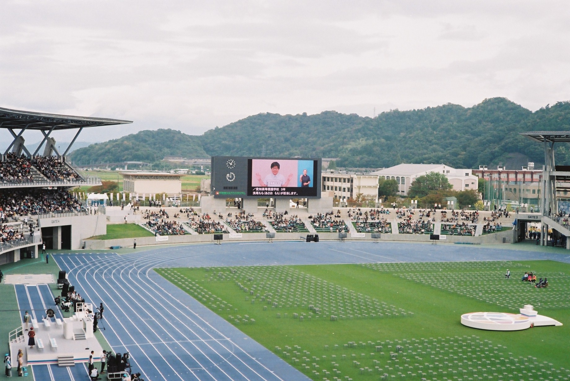 開会式では、なんと、本校3年生の浅尾ももさんがプロのアナウンサーや他校の生徒とともにアナウンスを担当しました。大きなスタジアム内に浅尾さんのはつらつとしたアナウンスが響くたび、観覧していた本校の生徒や教員からは歓声が沸いていました。当日までの練習も、他校の放送部生徒とともに頑張られ、当日もとても堂々としたアナウンスでした。本当にお疲れさまでした。